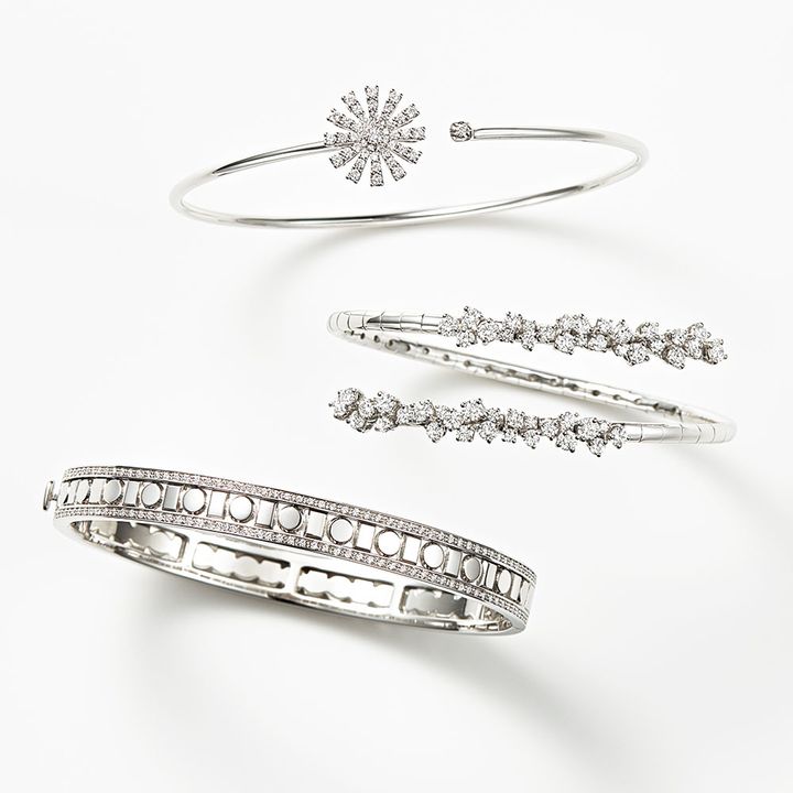 〈上から〉イタリア王国初代王妃へのオマージュとしてデザインされたコレクション。バングル「マルゲリータ」〈WG×DIA〉¥677,600ミモザの小さな花が軽やかに咲き乱れるような繊細な技術が目を見張ります。バングル「ミモザ」〈WG×DIA〉¥1,562,000アイコニックな「ベル エポック」は、コンテンポラリーなファッション性でデイリーに活躍するはず。バングル「ベル エポック・リール」〈WG×DIA〉¥1,859,000(すべてダミアーニ/ダミアーニ 銀座タワー)