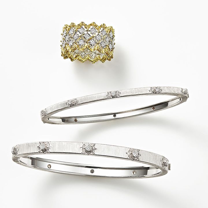 〈上から〉自然のモチーフを着想源に幾何学模様になるように象ったコレクション。見入ってしまう繊細な技術は手仕事からなるもの。リング「ロンビ」〈YG×WG×DIA〉¥1,980,000 マットなゴールドの細かな溝はなんと手仕事。小さな星型のロゼットにはめられたダイヤモンドのツヤと光の妙を楽しめる名品。バングル「マクリ」〈WG×DIA〉¥1,155,000バングル「マクリ」〈WG×DIA〉¥1,540,000(すべてブチェラッティ)