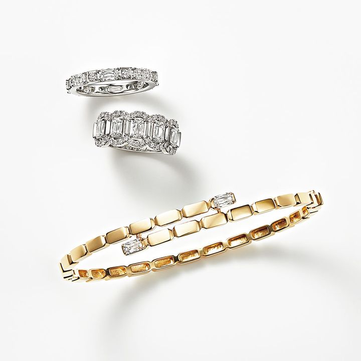 〈上から〉リング「ASHOKA ETERNITY」〈PT×DIA×アショカカットDIA〉¥2,310,000リング「ASHOKA KYO」〈PT×DIA×アショカカットDIA〉¥2,475,000ブレスレット「ASHOKA FORM」〈YG×アショカカットDIA〉¥1,870,000(すべてWAKO/和光)