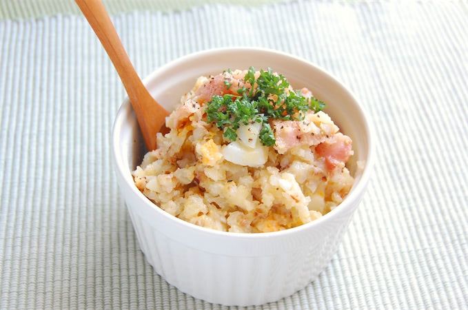 3. ハッシュドポテトが冷めたら、ベーコン、粗めに切ったゆで卵、マヨネーズ、黒こしょうを加えて混ぜます。