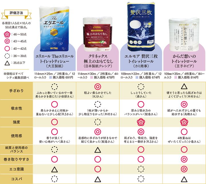 個人の好みやこだわりによるところが大きいトイレットペーパー。使い比べてみると、各社の特徴や強みが見えてくる結果となりました。普段使い比べる機会はあまりないため、「こんなに違うものなんだ!」という驚きの声も。デリケートな部位に触れるものだからこそ、特徴を見極めて、時期や体調で使い分けをするのもよさそう。進化を続けるトイレットペーパーからこれからも目を離せませんね。