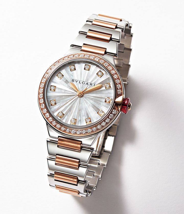 ジュエリーとのバランスもとりやすいピンクゴールドとステンレススティールのコンビ。はっと目を引くリューズにはカボションカットのシンセティックピンクサファイアとダイヤモンド一粒をセッティング。50m防水なので日常にタフに使っても安心です。