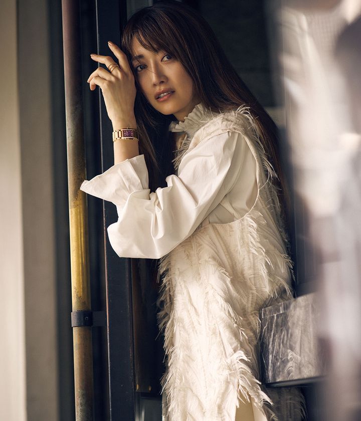 時計「Twenty~4」〈RG×DIA25.1×30㎜、クォーツムーブメント〉¥7,540,000(パテック フィリップ/パテック フィリップ ジャパン・インフォメーションセンター)ジレ¥79,200(ヒューエルミュージアム/ヒューエルミュージアム ギンザシックス)シャツ¥16,500(ダブルスタンダードクロージング/フィルム)リング¥737,000(マリハ)