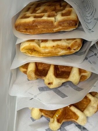 リエージュワッフルはパールシュガーを混ぜ込んだ丸い形のワッフル。外はサクッとしていて、中はもちもちだ。3つのワッフルは発酵バター。