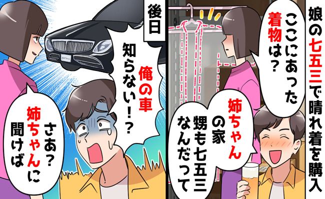 「ここにあった着物は!?」と夫に詰め寄ると、「姉ちゃんにあげたんだ。甥も七五三なんだって! 偶然だね!」と軽く答えました。