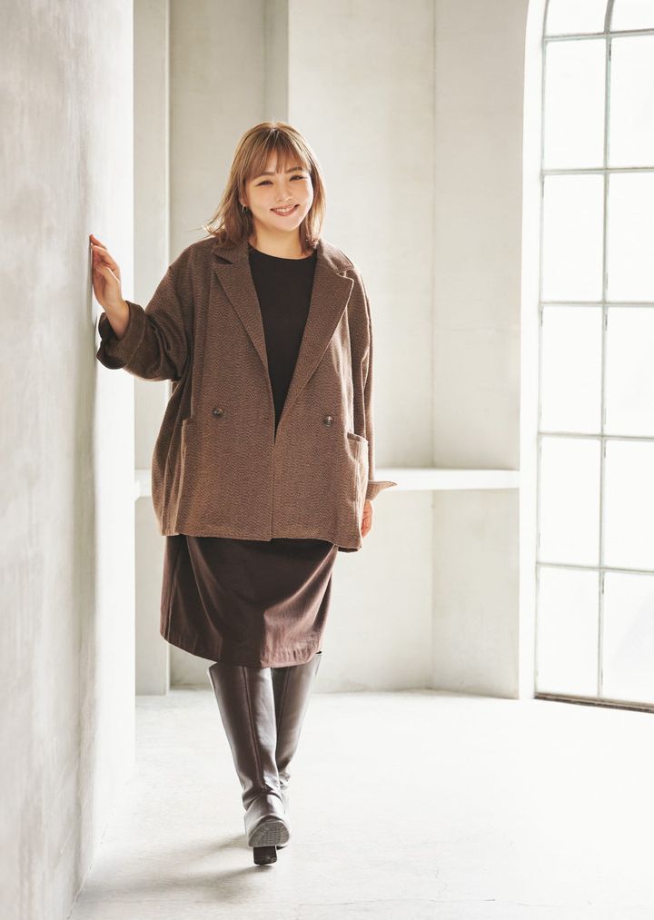 ツイードヘリンボーンダブルジャケット M〜3L ¥9,900/MEDE19F(フェリシモ) 5分袖ミニ丈ワンピース M〜10L ¥7,689〜¥8,459/CHIC STYLE(スマイルランド) イヤリング ¥3,960/コトモノマルシェ ルミネエスト新宿店 ロングブーツ 23.5〜26.5cm ¥9,790/la farfa SHOES