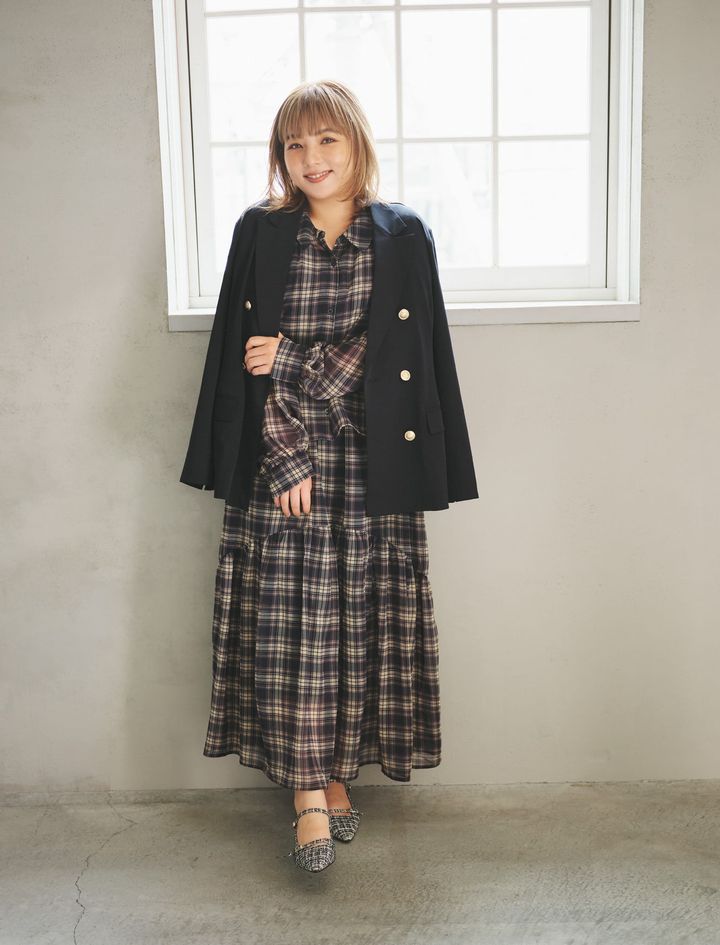 チェック柄シアーシャツ&キャミワンピース LL〜4L ¥8,789/Re-J&SUPURE ダブルボタンカットソーブレザー S〜4L ¥5,940/IEDIT(フェリシモ) イヤリング ¥2,860/コトモノマルシェ ルミネエスト新宿店 ツイードストラップパンプス 22〜25.5cm ¥16,500/NICAL