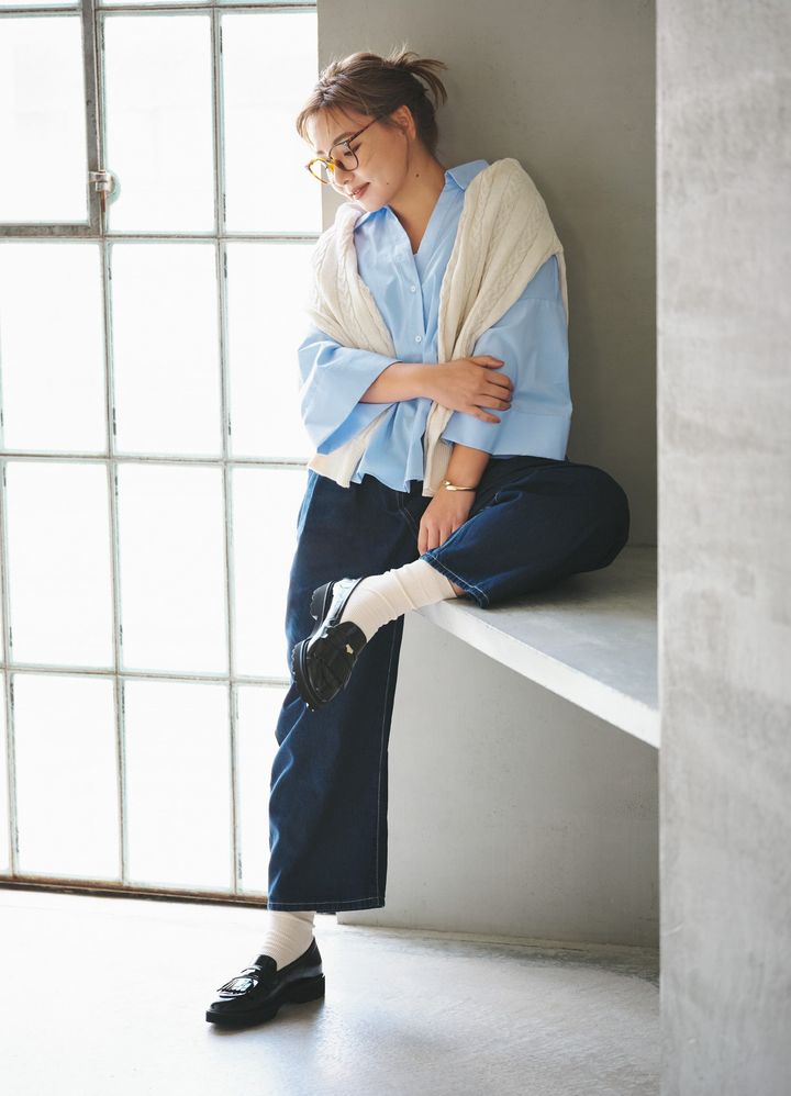 ワイドバギーデニムパンツ 1〜4 ¥6,424/09WOMEN 肩に掛けたロゴ刺しゅうケーブルニットトップス LL〜4L ¥2,970/クレット フレアスリーブポプリンシャツ XS〜XL ¥5,290/ZARA(ザラ カスタマーサービス) 中に着たスクエアネックリブタンクトップ 1、2 ¥4,490/エウルキューブ メガネ ¥328/SHEIN バングル ¥550/ラティス ソックス ¥1,210/タビオ(Tabio) コインローファー 21.5〜26.5cm ¥26,400/卑弥呼