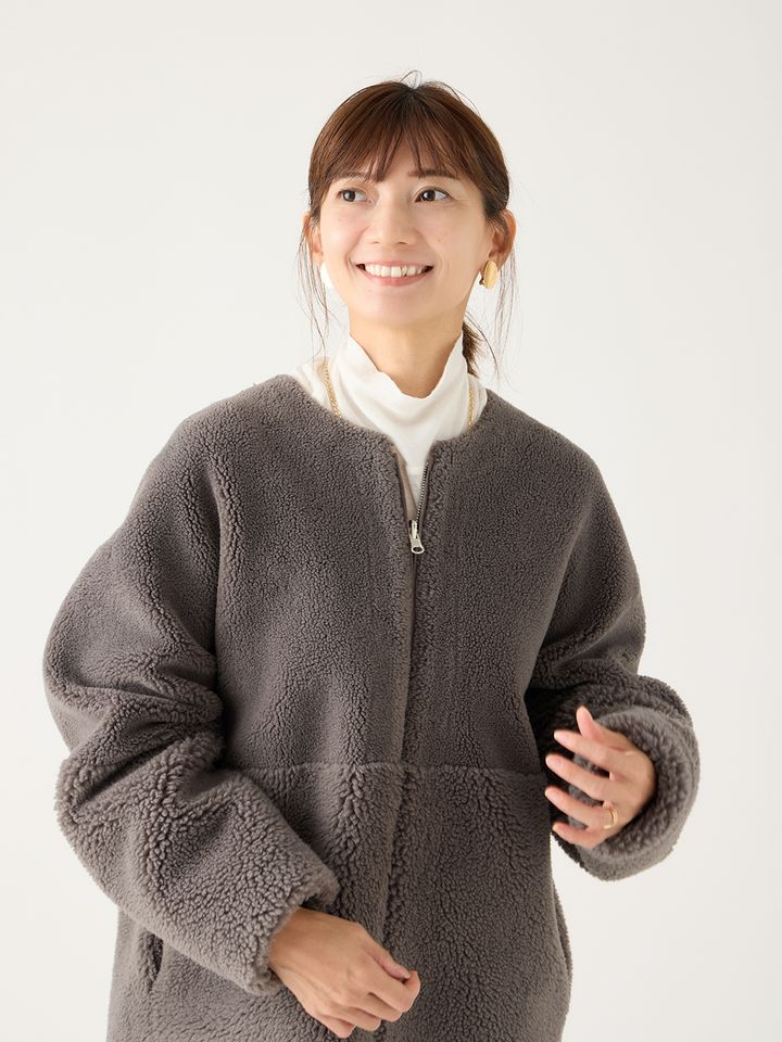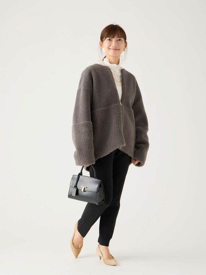 スモーキーなグレーのフワモコアウターで品よくカジュアルに