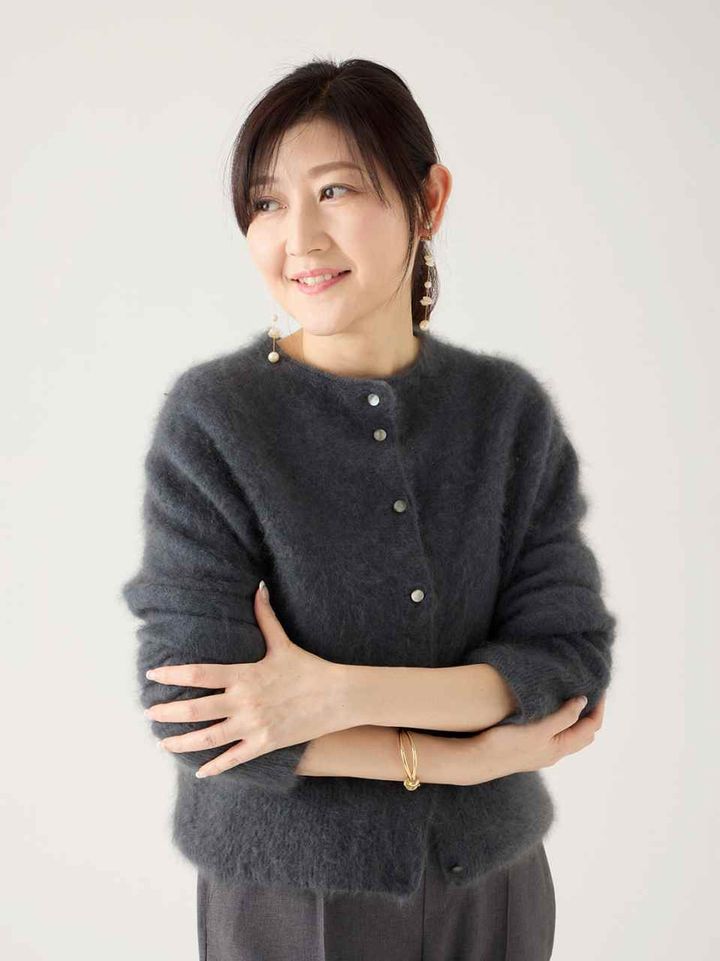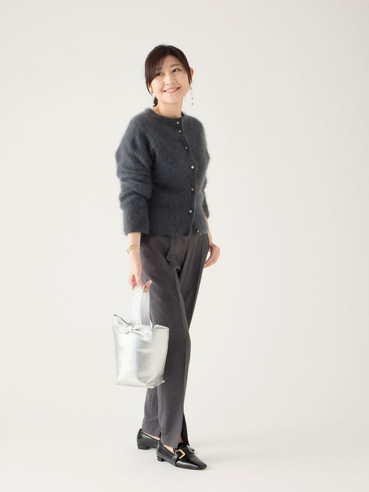 カーディガン¥51,700(エンリカ)パンツ¥20,900(カデュネ)バッグ¥39,600(イウエン マトフ)シューズ¥46,200(ファビオ ルスコーニ/アルアバイル)イヤリング¥5,720<アプロ>バングル¥88,000<スキャット>(ともにロードス)