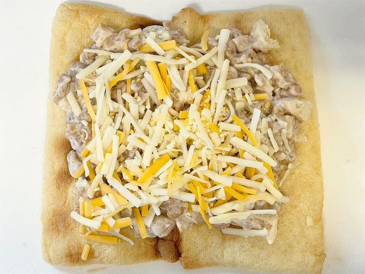 3. マヨネーズをかけて、ピザ用チーズをのせます。