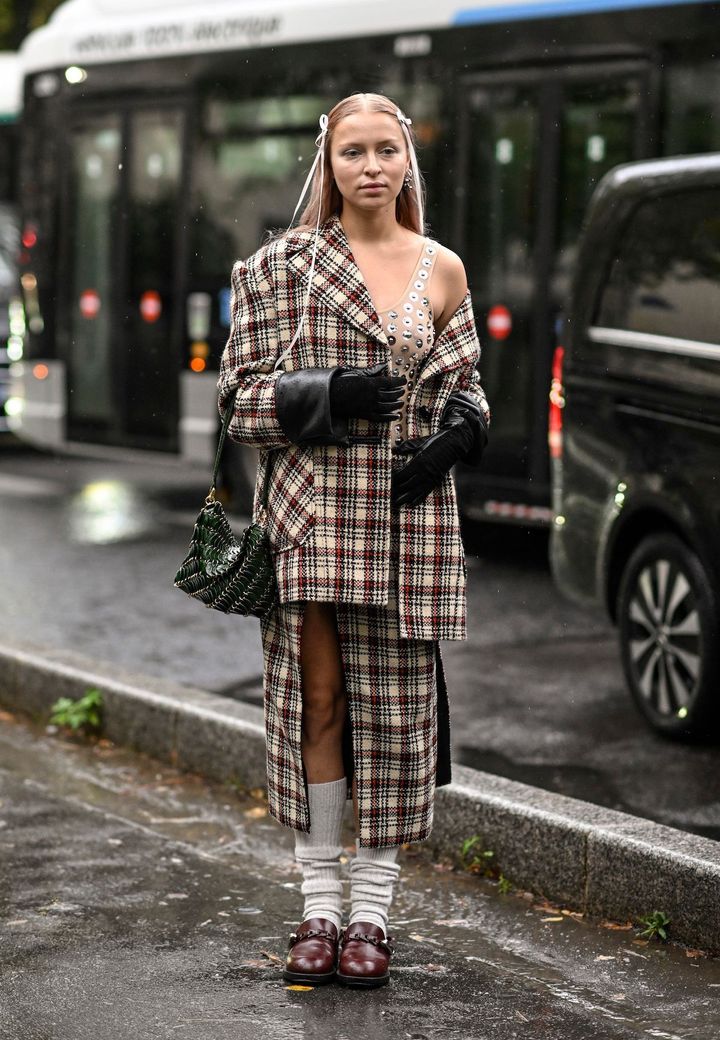 洗練されたチェックのセットアップをあえてラフに着こなすのも◎。ジャケットの片方の肩をちらりと落として主張強めなインナーをチラ見せするレイヤードテクを参考に。こちらのスナップでは、スカートのスリットや、Y2Kなムード漂うルーズソックスやリボンも相まって、ガーリーな上級者スタイルが完成。