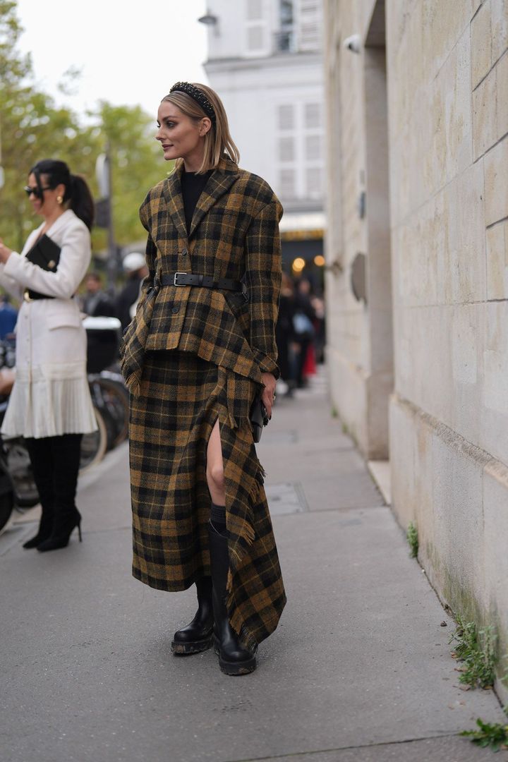 オリヴィア・パレルモは、ディオールDIOR)の2025年クルーズコレクションのセットアップでショー会場に登場。今年のトレンドカラー「オリーブグリーン」のタータンチェックやスカートのスリットによる抜け感で旬顔を演出した。ウェアとヘッドバンドのビジューのカラーリングを合わせているのもお見事。