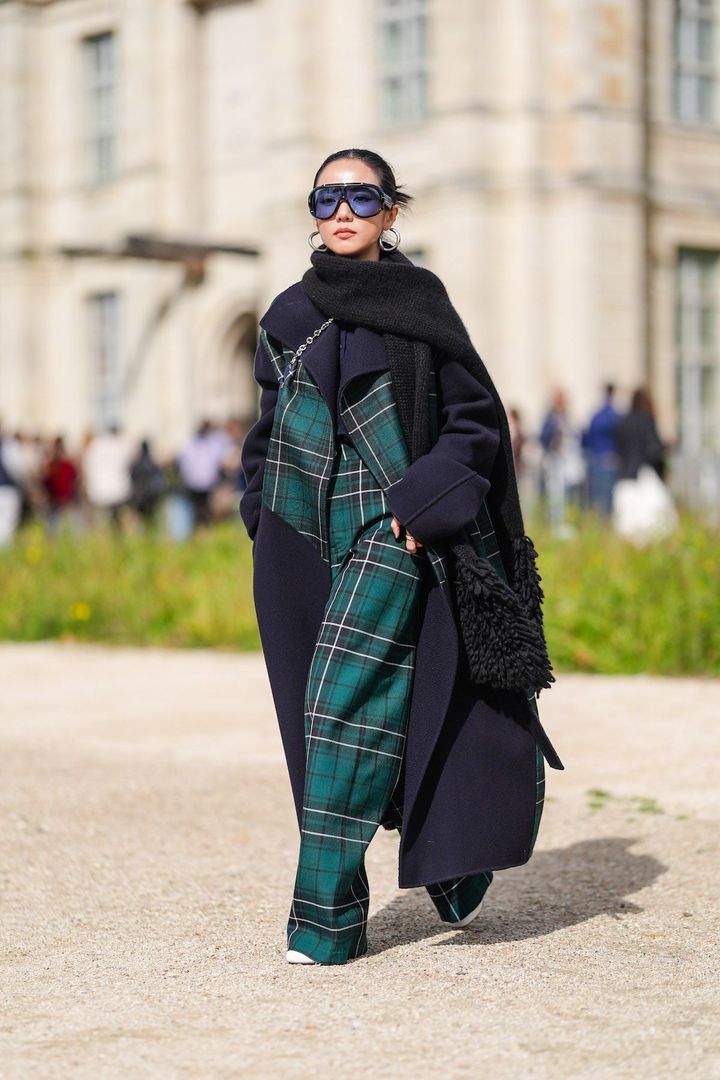 チェック柄が主役のコーデは、ともするとカジュアル過ぎるルックになってしまいがち。上のスナップのように、ブラックやネイビーなどシックなカラーと合わせるのがおすすめだ。ボリューミーなサングラスやマフラー、シルバーのフープピアスなどの小物でアクセントを効かせ、モードに格上げして。