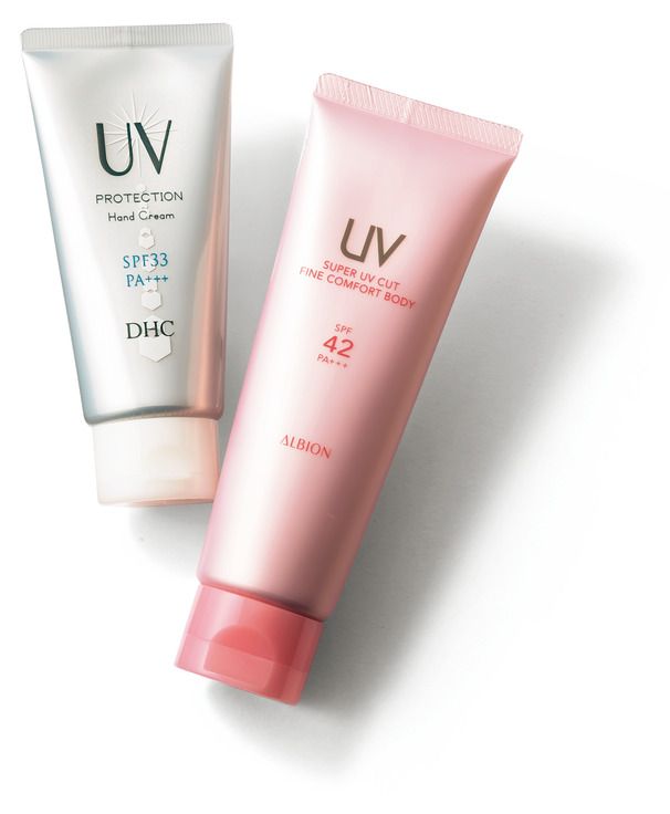 ㊧「信頼する母が使っていた影響で使い始めました。なめらかな潤いが持続する高保湿なのにベタつきません」。SPF33 PA+++ 60g ¥900DHCUVハンドクリーム ㊨「日焼け止めなのに香りがとてもよく、サラサラの仕上がりなので、手を使うことが多い日中に最適」。アルビオンスーパーUVカットファインコンフォートボディ SPF42 PA+++ 120g ¥3,500