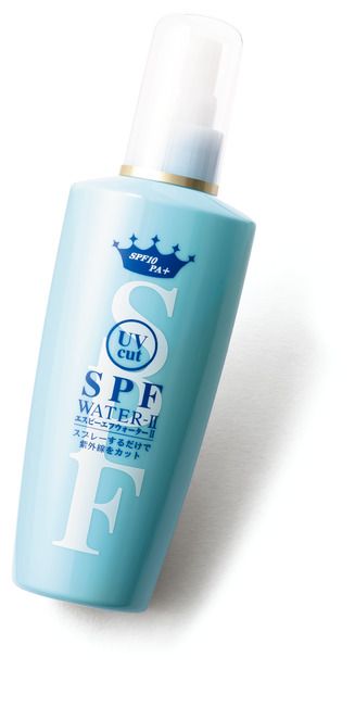 「撮影時の衣装は汚せないので仕事中UVケアしたいときにお役立ち。衣服にかかっても大丈夫なので安心」。国際化学工業 SPFウォーターⅡSPF10 PA+ 140㎖ ¥3,500