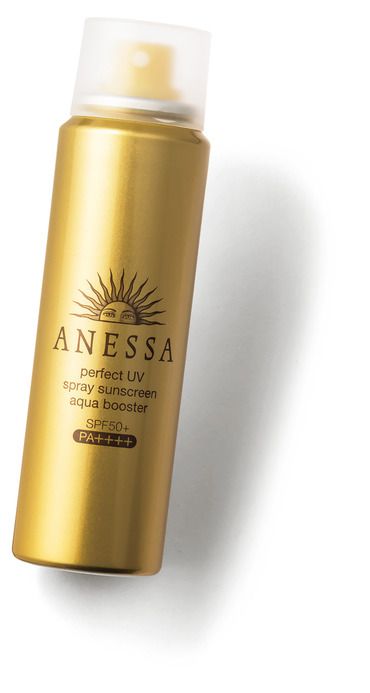「出先でも簡単に塗り直しができるのがスプレー。手では塗りにくい背中などにも◎」。アネッサパーフェクトUVスプレーアクアブースターSPF50+ PA++++60g ¥1,800(編集部調べ/資生堂)