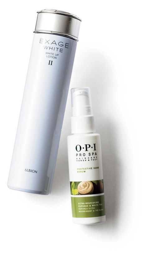 ㊧「顔用の美白ローションはパッティングで入れ込みます。首の後ろなど塗りにくいところはスプレーに移してシュッ」。アルビオンエクサージュホワイトホワイトアップローション Ⅰ110㎖ ¥3,000 ㊨O・P・Iプロスパ プロテクティブハンドセラムフェイシャルケアに使われる成分とテクノロジーを手足のケアに取り入れたプロ用美容液。「小サイズは持ち歩き用に」。60㎖ ¥4,300
