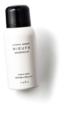 「主に髪用に使用。夏は帽子の中で汗をかくので匂い防止の意味でもほんわり香りつきが◎」。ミーファフレグランスUVスプレーマグノリア SPF50+ PA++++ 80g ¥1,200(ナプラ)