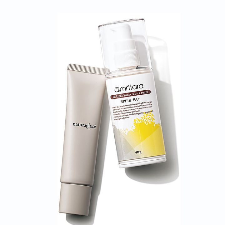 〈左〉「ライトな使用感で日焼け止めを塗っている感じはしないのに、SPF44という高いUVカット効果が!トーンアップした明るい肌になれるので、メークの ファーストステップとして仕込みます」ナチュラグラッセ メイクアップクリームN SPF44 PA+++30g ¥3,080(ネイチャーズウェイ〈ナチュラグラッセ〉) 〈右〉「デイリーな日焼け止めとして使いたいアイテム。軽くて美容クリームのような塗り心地です。ブルーライトまでカットしてくれるのも嬉しい。ツヤのあるキレイな肌に近づけます」アムリターラ オールライトサンスクリーンクリームSPF18PA+40g ¥4,180(アムリターラ)