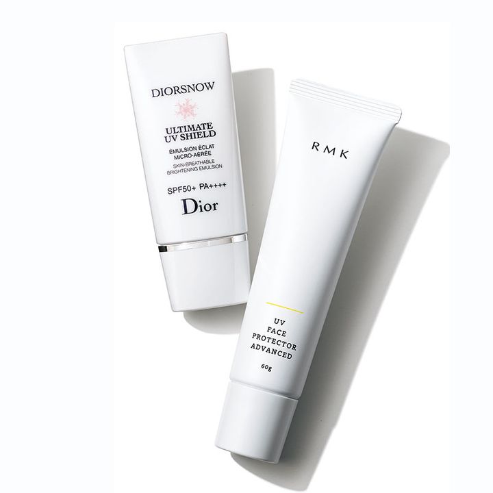 〈左〉「保湿力が高く、ベースの前に仕込むとツヤを引き出してくれます。ほのかなピンク色が自然にくすみをとばし、キレイなベースメークをつくる土台になってくれます。夕方になってもくすみにくく、美しい肌をキープ。カバー力のあるファンデを使っても乾燥しにくい点も優秀」スノーアルティメットUVシールド50+SPF50+PA++++30㎖ ¥6,930(パルファン・クリスチャン・ディオール)〈右〉「UVカット効果が高いのに、スキンケアのような保湿力を兼ね備えたアイテム。ジェル状のクリームが肌にスッとなじみ、素肌のような仕上がりに。スーパーウォータープルーフ処方なので、汗をかきそうな日やレジャーなど、お出かけの時にも頼りになります」RMK UVフェイスプロテクターアドバンスドSPF50+PA++++60g ¥3,850(RMK Division)