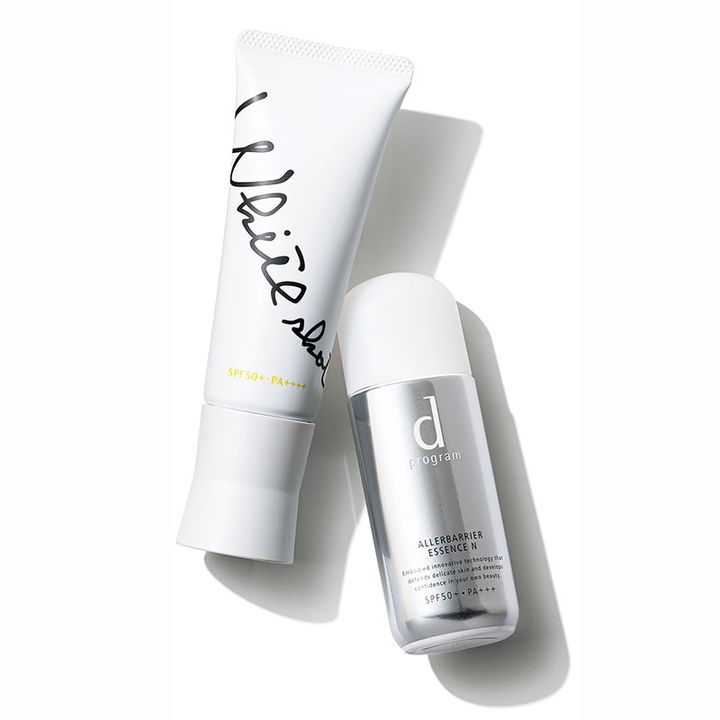 〈左〉「ピッタリ、しっとりと肌を守る、とにかく安心感しかない最大の防御力!ストレス変動の高いホルモン“メラトニン„にアプローチし、日焼けダメージを起こしにくい肌に育ててくれます。理論的にもテクスチャーも今年、私的最高の日焼け止めです」ポーラ ホワイトショット スキンプロテクターDX SPF50+ PA++++〈医薬部外品〉45g ¥6,600(ポーラお客さま相談室)〈右〉「花粉・微粒子・紫外線など外的ストレスからの防御だけでなく、乾燥や肌荒れを抑えるスキンケア成分も贅沢配合。肌が揺らいでいる時にも予防的に使いたい。マスクによる肌荒れが気になる人にもお勧めです」dプログラム アレルバリア エッセンス N SPF50+PA+++40㎖ ¥3,300(資生堂インターナショナル)