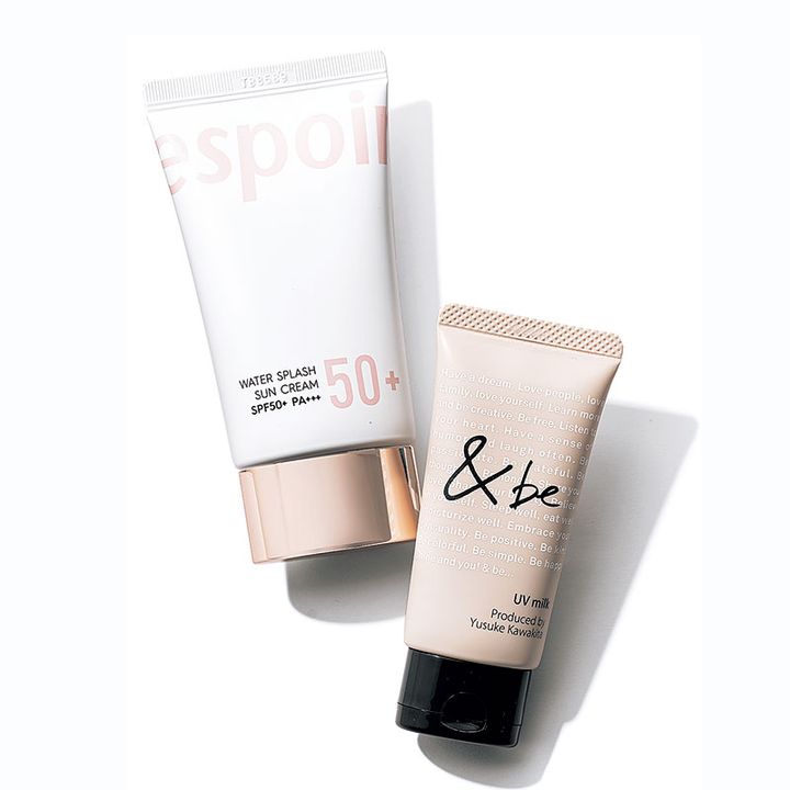 〈左〉「つるっとしたツヤ感が出て、肌の凹凸を光でなめらかに見せてくれます。ツヤの印象もギラギラした感じではなく、とても自然な仕上がり。トーンアップ、補整効果があるのにつけ心地がここまで軽いものは、なかなかないと思います」エスポア ウォータースプラッシュ サンクリームSPF50+PA+++60㎖ ¥2,420(インターナショナルコスメティックス)〈右〉「自然なツヤ感がキレイで、テクスチャーもとても柔らかくて伸びがいい。トーンアップ効果がしっかりあるので、ちょっとした近所へのお出かけならこれ1本で出かけることも多いです。しっとり感もたっぷりで長時間つけていても安心」&be UVミルク〈スタンダード〉 SPF50PA++++30g ¥1,980(Clue)