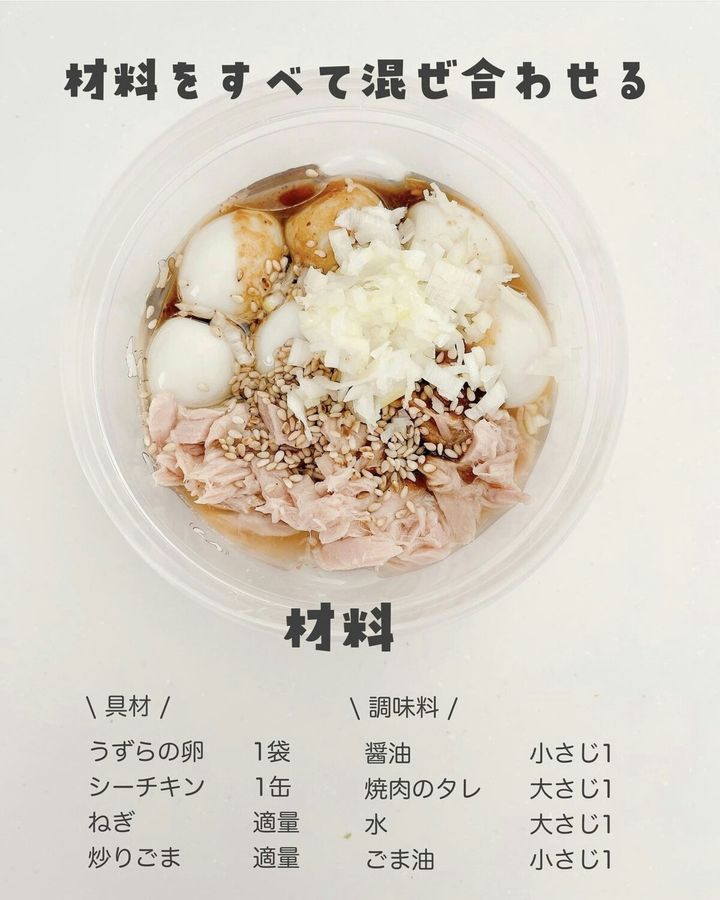 あとは、全部の材料を混ぜ合わせるだけ。子どもが食べやすいようにうずらのタマゴを使ってるから、タマゴをゆでる手間は無し。主婦が待ってるのはこういうレシピだと思うのよね。こういうレシピをいくつか自分の料理のストックに持っておくと、疲れた時や忙しい時にとても助かりますよね。