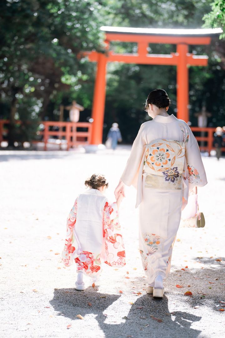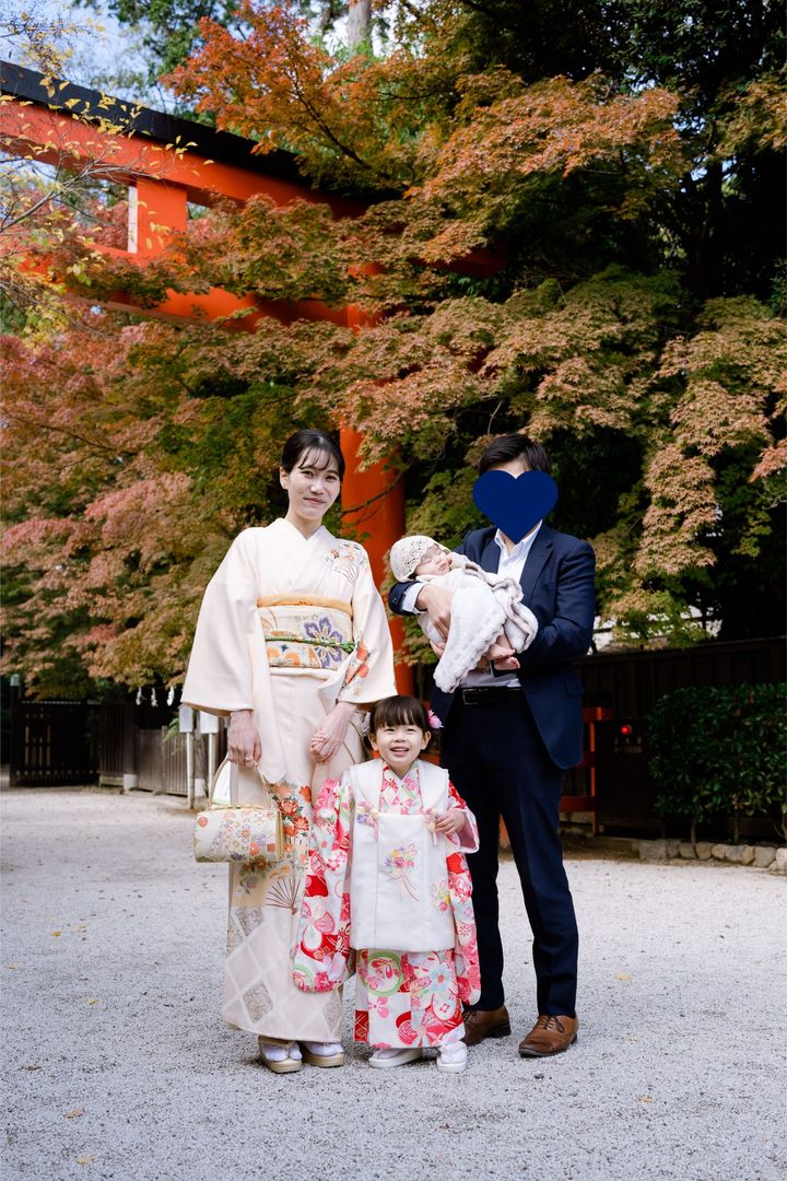 「11月の七五三の週末に、実家の京都でロケーションフォトができる神社を探し、赤い鳥居がある下鴨神社で3歳の七五三を行いました。私の着物は母が着ていたもので、薄いサーモンピンクの色で顔映りよく見えて気に入っています。娘の着物は京都の夢館というお店でレンタルしたもの。3歳なので今しか着られないような子どもらしい存在感のある梅の柄が可愛かったです。実際に見て選べたので5着ほど私が候補を出し、そのなかから娘自身が気に入ったものを着用しました」仲田侑紀さん・32歳(金融関係勤務/3歳と1歳の女の子ママ)