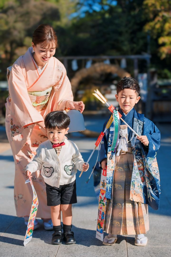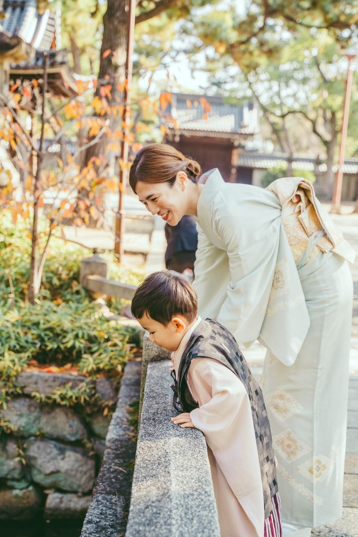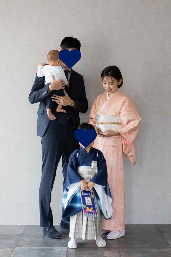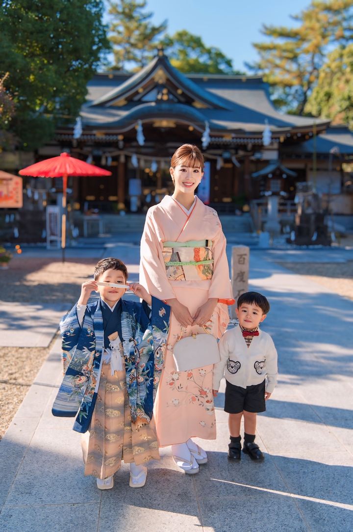 「12月上旬に大阪市の住吉大社で次男のお宮参りとともに行いました。時期がずれたことでロケーションフォトもいい写真が撮れたので、おすすめの時期かもしれません。着物は私も息子もまとめて日本橋・円居のサイトでレンタル。好みの色を選べたり、手持ちの着物があっても気分を変えられるのでおすすめ。黄緑は落ち着いた雰囲気で人ともかぶらずとよかったです。3歳の息子も青系が多いなか、珍しい薄ピンクに。あどけない可愛さが残せたので、5歳は一変してかっこいい雰囲気にできたらいいなと思っています」梅本弓夏さん・37歳(医師/4歳と1歳の男の子ママ)
