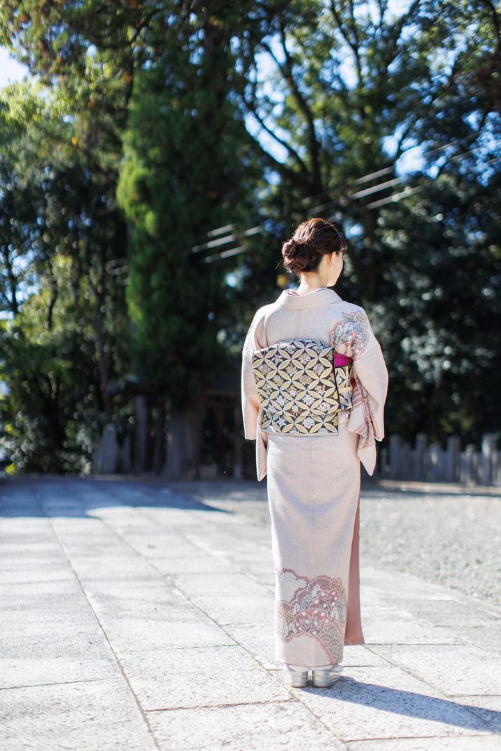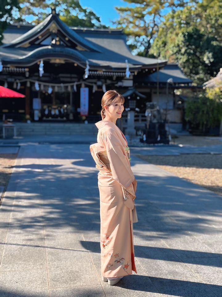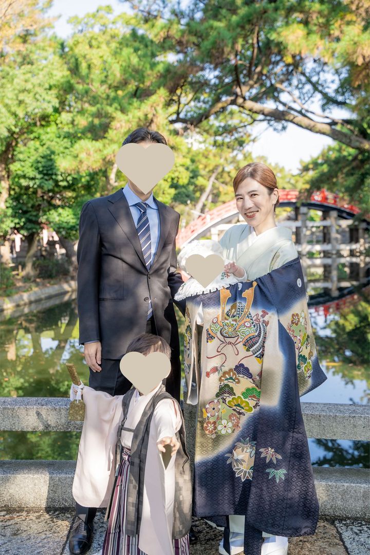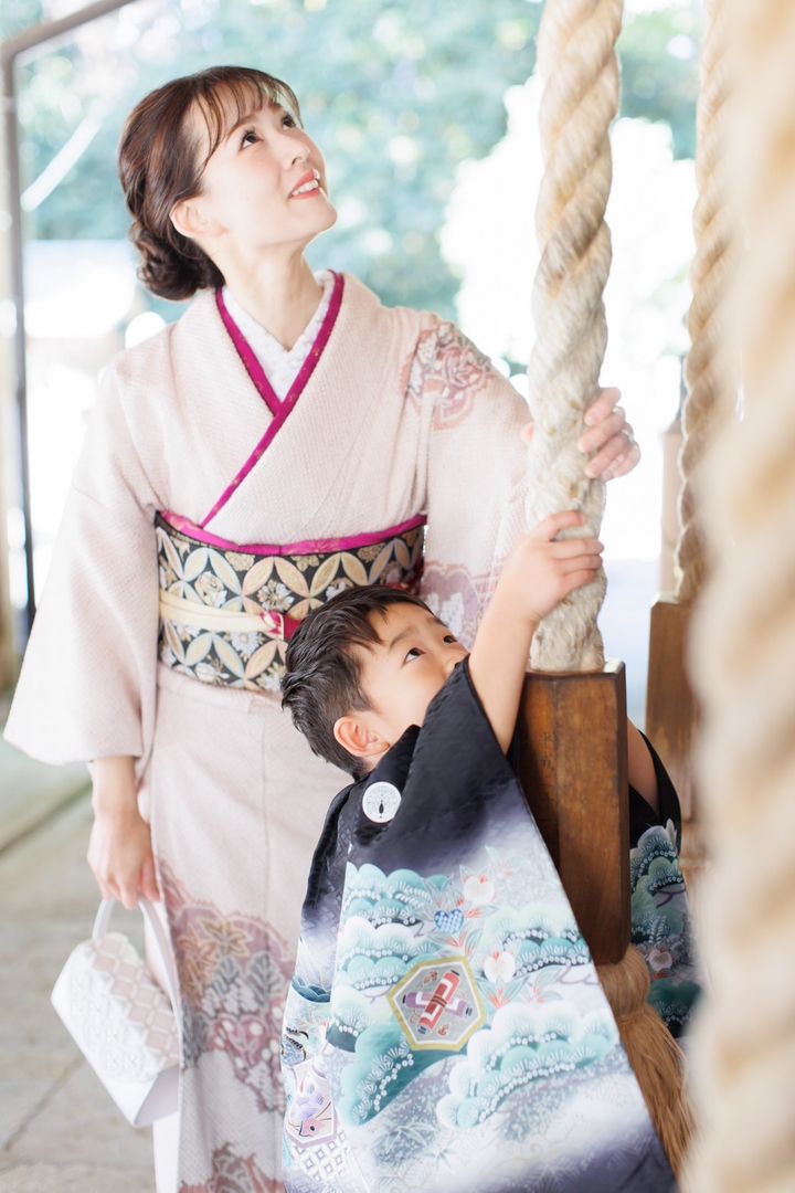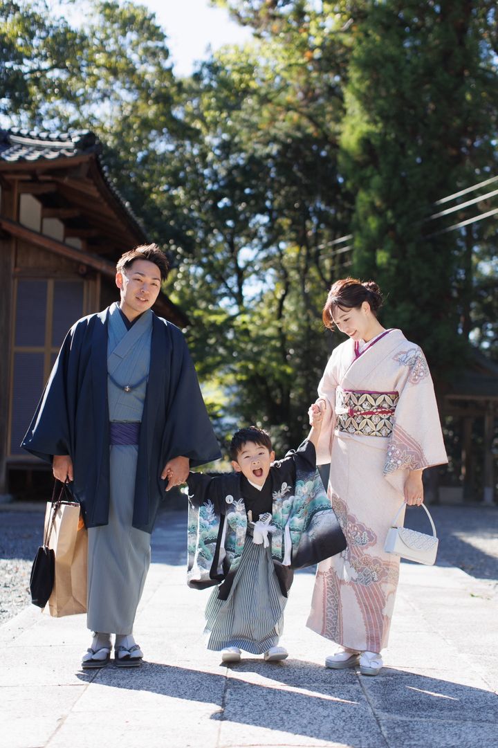 「私の地元、兵庫県宍粟市の山崎八幡神社でお詣りをしました。出張撮影を頼んでいたので、神社に人が多すぎない10月末に実施。着物は母から譲り受けた訪問着で、藤娘きぬたやのもの。総絞りの淡い桜色の色合いで、やわらかい雰囲気が出るところがお気に入りです。七宝の柄の西陣帯で全体を引き締めました。息子の紋付着物と仙台平の袴も私の訪問着と同じ地元の呉服店で購入。黒字に今にも飛び立ちそうな鷹が存在感があり、最強王図鑑にハマっている息子も強そうだと喜んで着てくれました(笑)。夫の着物は私の実家からのお祝いで、こちらも新調し、統一感を出せました」夏目美幸さん・36歳(看護師/6歳の男の子ママ)