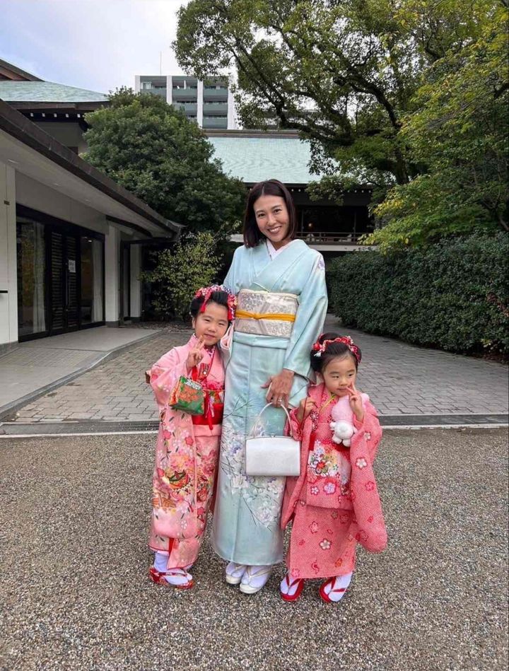 「西宮市の西宮神社で、7歳と3歳の娘たちのダブル七五三をしました。時期は七五三の週末を選びました。私の着物は水色で、母から譲り受けたもの。子どもたちと対照的な色にできたので写真映えしました。娘たちの着物は神社内の会館でレンタルしました。当日は着付けてもらってすぐ脱いで帰れるので機嫌を損ねずお詣りでき、事前に試着して選べるのもよかったです」百瀬侑里さん・37歳(主婦/7歳と3歳の女の子ママ)