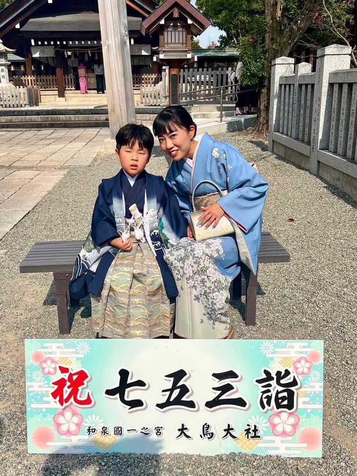 「大安ということ以外こだわりがなかったので、堺市の大島大社で11月頭にお詣りしました。七五三前後の日だと混んでいそうだったのと、着たい着物が借りやすい時期だったので、この日にして正解でした。私の着物はRENCAというサイトでレンタル。小物まで一式借りられる点と、種類が豊富なので好みのものを選べてよかったです。息子の着物は撮影スタジオで紺色のものをレンタルしていたので、私は息子に合わせて水色ベースで探しました。写真を撮ったときにまとまりが出たので、色味を合わせられてよかったです」藤田 遥さん・33歳(SNSマーケティング会社勤務/6歳の男の子ママ)
