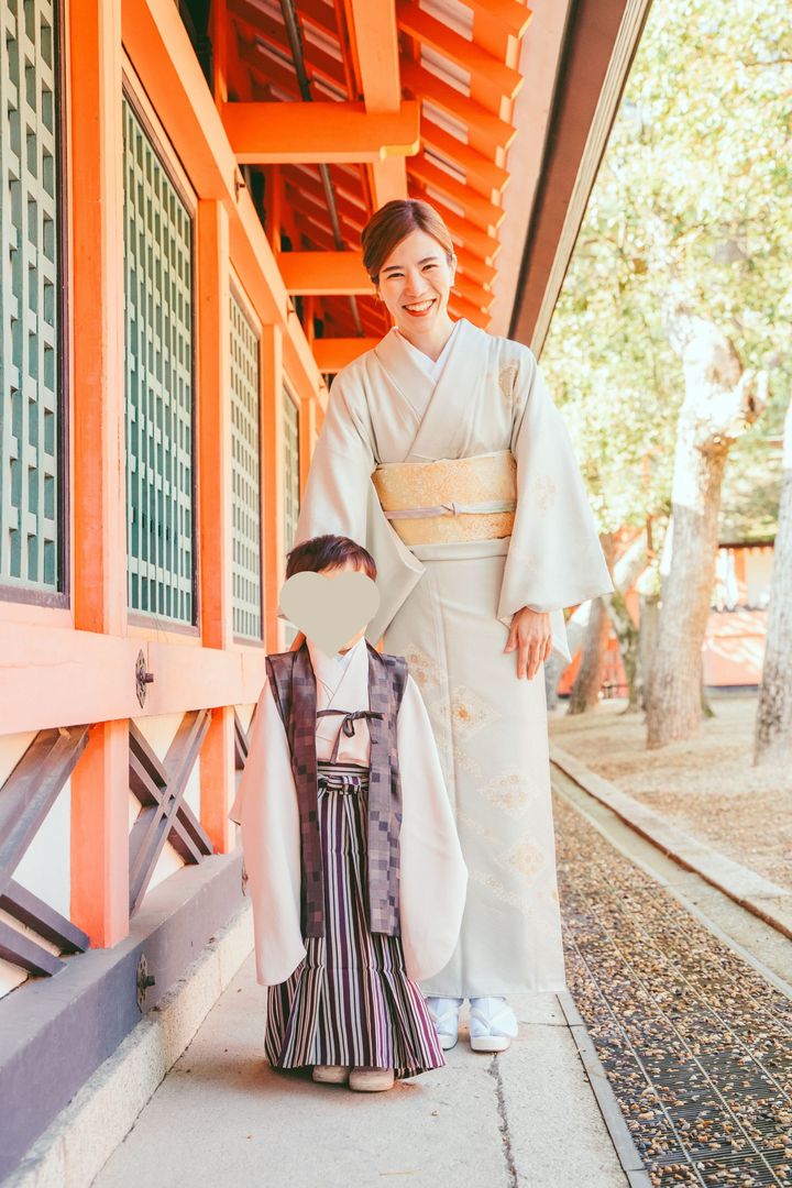 「我が家と縁のある西宮市の広田神社で11月末に行いました。私の着物は母から譲り受けたもので、桃色に見える赤と白の総絞り。帯は華やかなシルバーにしました。息子の着物は夫が子どもの頃、七五三で着用したもの。袴は持っていなかったので、当日写真館で選ばせてもらいました。夫も自分の着物を着せられて、感慨深かったようです」福留絵里子さん・39歳(会社員/5歳と1歳の男の子ママ)