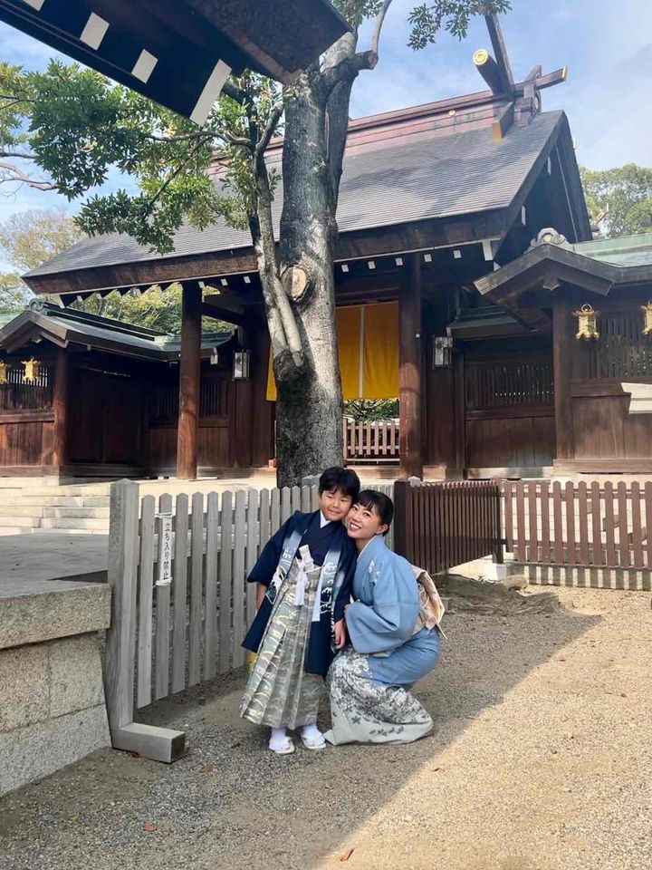 「長男5歳の七五三は氏神様である藤井寺市の辛國神社で11月末に行いました。空いていて参拝もスムーズだったので少し紅葉も色付いていて、むしろ良かったです。私の着物は母から譲り受けたもの。主張しすぎない桃色の色味と落ち着いた柄が気に入っています。帯は華やかなゴールドでお祝いを意識し、帯締めを黄緑にして爽やかにまとめました。息子は貸衣装ぽえむというネットショップでレンタル。5歳の七五三は息子自身に着物を選んでもらったのですが、袴がゴールドなところがお気に入りだそうです」吉田由嘉利さん・35歳(主婦/6歳と4歳の男の子ママ)