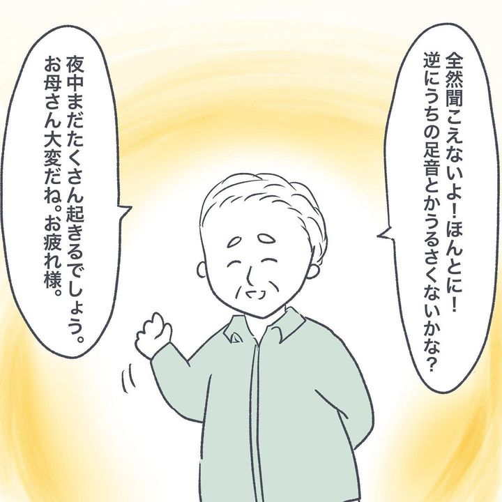 上の階の男性のやさしさが伝わってきますね。足音が聞こえるくらいなので、きっとぽこくんの泣き声も聞こえていたはず。それでも、「夜中まだたくさん起きるでしょう。お母さん大変だね。お疲れ様」と声をかけてくれて、ぬぴさんもさぞ安心したことでしょう。