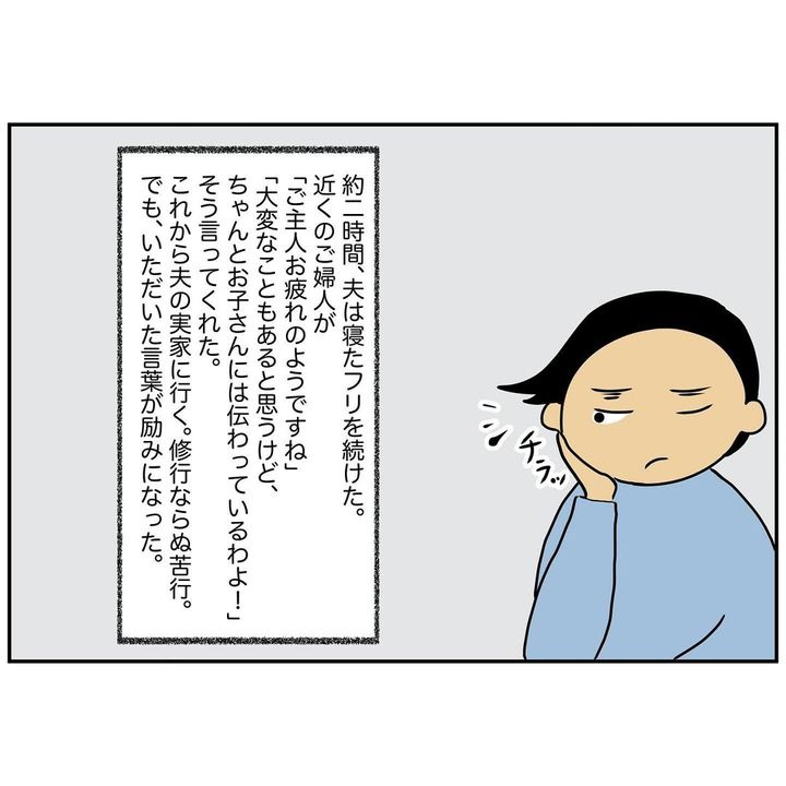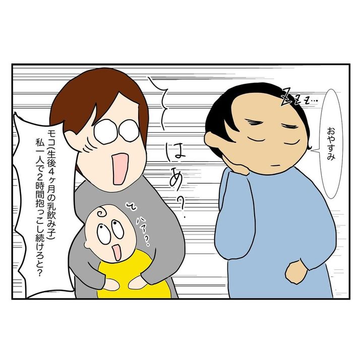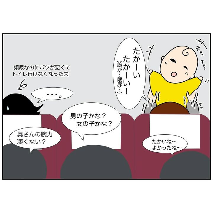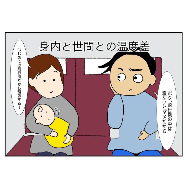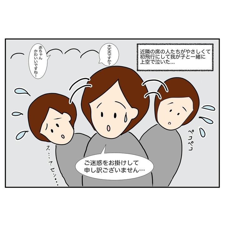 モコさんを初めて飛行機に乗せると、案の定、泣いてしまいます。夫は寝たフリをしたまま協力してくれませんでしたが、周りの乗客が「大丈夫ですか?」「赤ちゃんかわいいですね!」と優しい言葉をかけてくれたのでした。