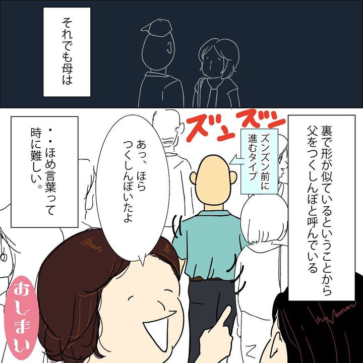いつも優しく、怒ることがないもちすけさん。しかし、「色白いよねぇ」という言葉を耳にした途端、顔がこわばったそうです。それ以来、肌の白さについて言うのは控えているのだとか。一方で、頭が小さいことを気にしているささこもちさんのお父さんに対し、こっそり“つくしんぼ”と呼んでいるお母さん。ささこもちさんは「褒め言葉って時に難しい」と感じたのでした。