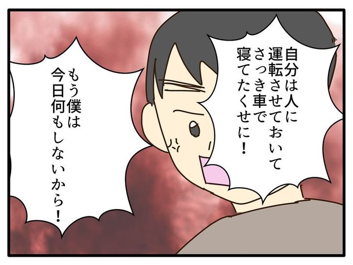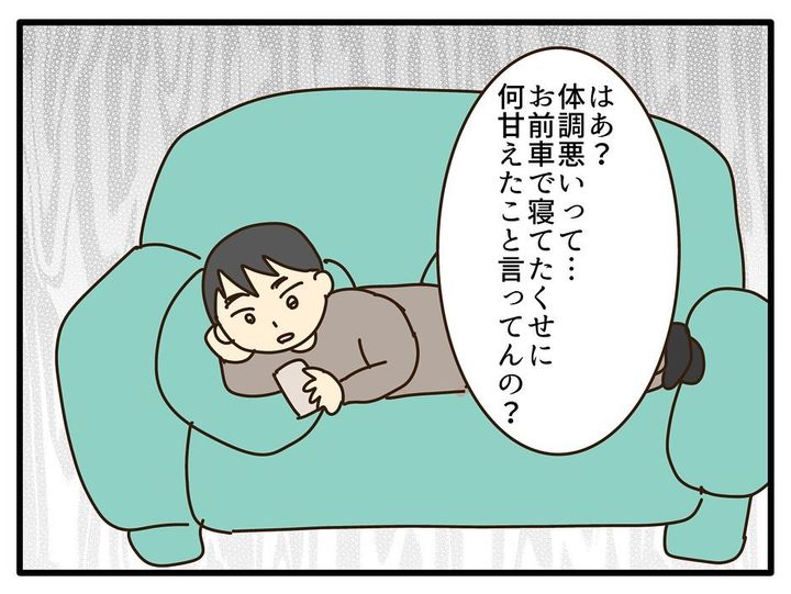 妊娠・出産後、サトシさんは態度が急変したのだとか。ある日の外出中、まゆみさんが車でうたた寝をしたことに激怒!体調が悪い中、家事や育児に追われて昼食の準備ができなかったまゆみさんですが、サトシさんは「車で寝てたくせに何甘えたこと言ってんの?」と、理解を示す様子はありませんでした。堪忍袋の緒が切れたまゆみさんは、「この子と出て行く」と宣言したのでした。