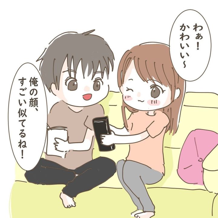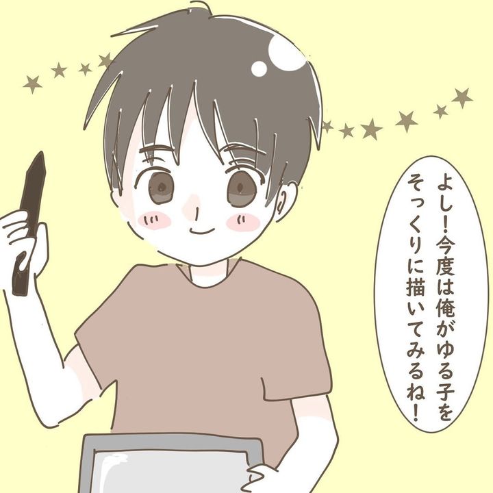 ふわ夫さんにSNSの投稿を見せると、「これさぁーゆる子ちゃんの顔盛りすぎじゃない!?(笑)」とのこと。ふわ夫さんがゆる子さんの似顔絵を描いてみたところ、やたらリアルな仕上がりになってしまうのでした。