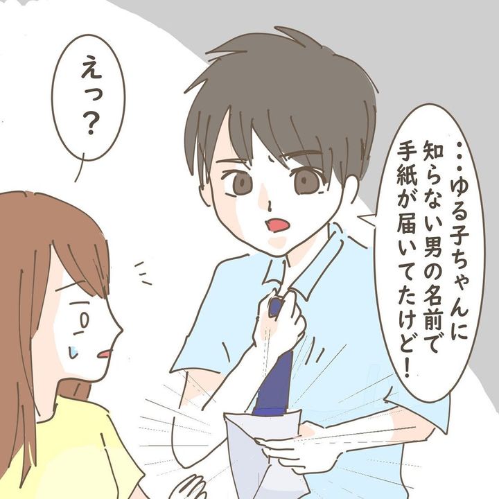 滅多に怒らないふわ夫さんが、不機嫌そうな表情で帰宅します。「…ゆる子ちゃんに知らない男の名前で手紙が届いてたけど!」と、不機嫌な理由を明かしますが、実は美容室からのダイレクトメールだったのでした。