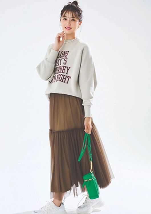 チュールスカートはロゴトップスでカジュアルダウンして!