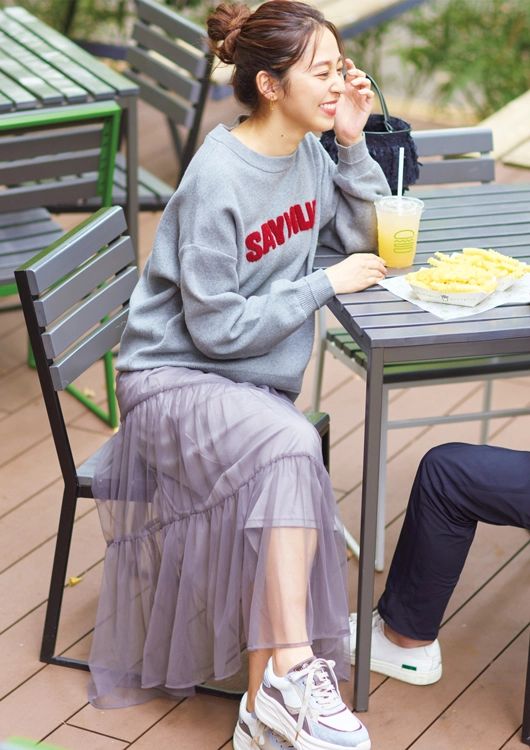 膝下がほんのり透けるスカートで甘カジュアルに女っぽさを一滴。あいまいなニュアンスカラーまとめで大人っぽく。