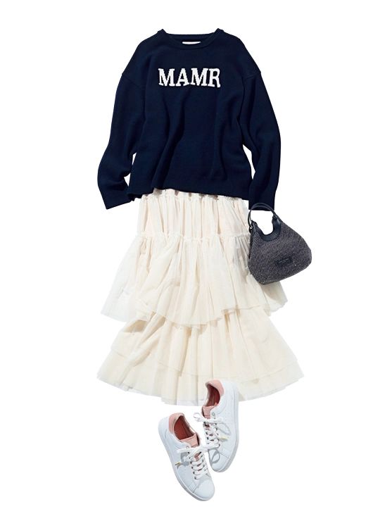 ニット¥31,900/マルモア(DMC) スカート¥14,960/And Couture(And Couture ルミネ新宿店) バッグ¥40,700/ジャンニ キアリーニ(ジャンニ キアリーニ 銀座店) スニーカー¥14,300/プラス ダイアナ(ダイアナ 原宿店)