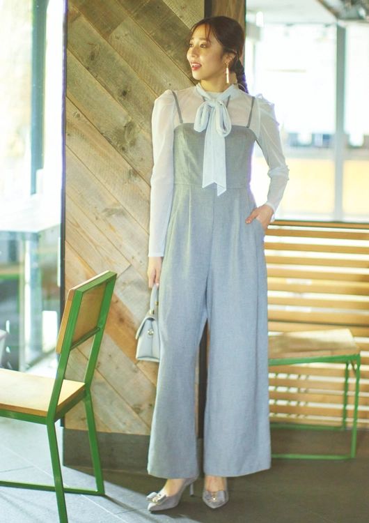 オールインワン¥27,500/Stola. シースルーボウタイニット¥7,920/31 Sons de mode(ヒロタ) ピアス¥12,100/ワンエーアールバイウノアエレ(ウノアエレ) バッグ¥5,800/Olu. パンプス¥10,890/RANDA