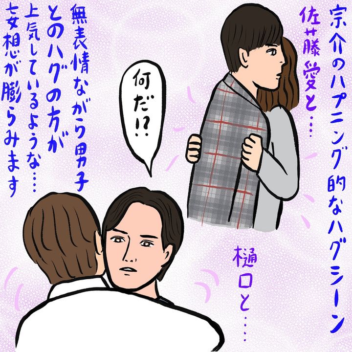 いずれにせよ、宗介と佐藤愛の再会後のお互いの第一印象は最悪でした。周りに仕事を押し付けられたり、宗介に怒られてばかりの佐藤愛を応援し、サポートする優しい同僚、樋口拓也を『チェリまほ』の赤楚衛二が演じていて、彼の存在はドラマの中で癒しです。その『チェリまほ』からの流れか、佐藤愛が思い出のパズルのピースを編集部内で落としてしまい、それに宗介が気付きそうになった瞬間、とっさに樋口が宗介をハグして足元のパズルを見せないようにする、というサービスシーンがありました。「何のハグだ!?」と動揺する宗介に「すいません……BL特集のこと考えてて思わず。意外と鍛えてんですね」と樋口。赤楚衛二にこのセリフを言わせるとは、『チェリまほ』ファンも取り込めそうです。抱き合っている時の表情に萌えつつ、『未満警察 ミッドナイトランナー』で期待したけれど見ることができなかったケンティのBL(?)シーンをありがたく拝ませていただけました。また何かのハプニングでこのカップリングが見られることを期待します。三角関係以上の四角関係になりそうです……。