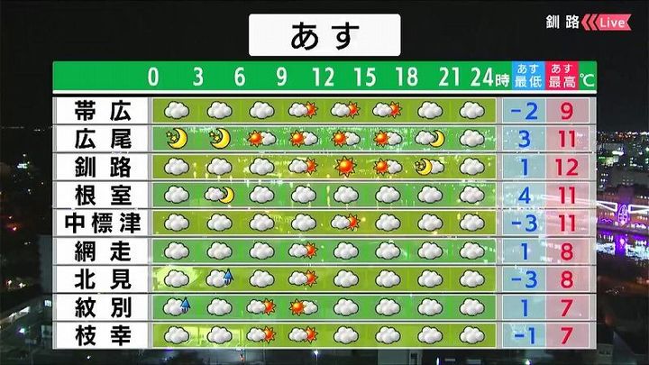 あすも雲が広がりますが、日中以降天気の崩れはないでしょう。気温は平年より高いです。けさ‐8度まで下がった北見のあす朝の最低気温は‐3度、最高気温は釧路で12度まで上がる予想です。