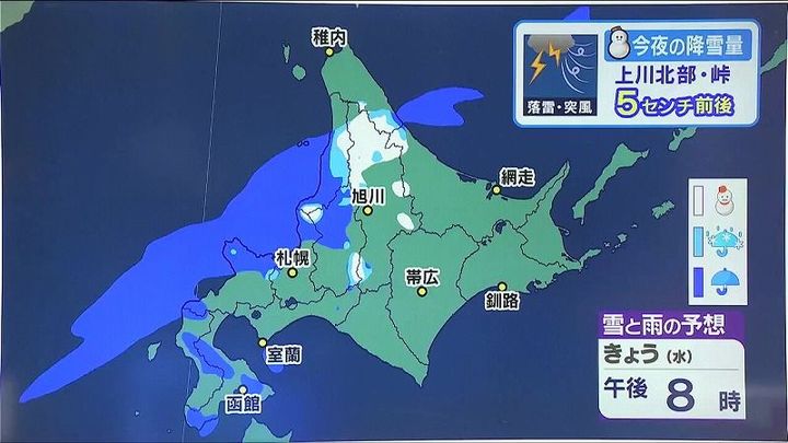 旭川は雨が降りやすく、札幌も日付が変わる頃は雨、あす21日(木)早朝はオホーツク海側でも天気が崩れます。落雷や突風などに注意して下さい。また、峠や上川北部の名寄や幌加内、美深町周辺では5センチ前後の雪が降るため、路面状況の変化に注意が必要です。