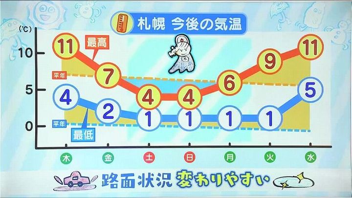 週末は寒気が強まり、再び冬らしくなります。土日の最高気温は4度にとどまります。最低気温は0度くらいまで下がる日が多いため、この先も変わりやすい路面状況に注意して下さい。