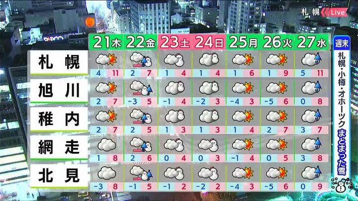 22日(金)は低気圧の影響で、午後を中心に雨や雪が降ります。土日は冬型の気圧配置になり、札幌や小樽、オホーツク海側を中心に雪や風が強まり、積もるでしょう。